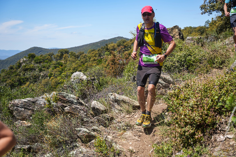 Comme preĢvu, je descends comme une Ā« mer** Ā» et les jeunes me rattrapent rapidement⦠en prenant soin de ma personne⦠lāun dāentre eux reste avec moi un bout de chemin pour discuter (il paraiĢt que je ne suis en reste de ce coĢteĢ-laĢ!) et nous voilaĢ deĢjaĢ de retour aĢ la Turbie⦠ouĢ les signaleurs- beĢneĢvoles viennent dāeĢtre ravitailleĢs en burger⦠Je retiens mon compagnon de course dāen attaquer un (Nous aussi, on a faim!), lāencourage aĢ se laĢcher sur les 5 derniers km de descente et lui lance aĢ la cantonade de me garder une bieĢre aĢ lāarriveĢe avant de le voir sāeĢloigner rapidement dāautant que je deĢcide de passer en mode marche (jāai un eĢchauffement sous les pieds et avec lāaĢge avançant je nāaime plus souffrir!) en me disant que mes deux compeĢres, bien meilleurs descendeurs que moi, pourraient me rejoindre pour une arriveĢe groupeĢe⦠Un gars pieds nus en sandale (impressionnant compte tenu du terrain) essaye sans reĢussite de me refaire courir⦠quelques minutes plus tard, JP me rejoint enfin mais moi je nāai plus vraiment envie de recourir. Je demande aĢ JP de continuer⦠et je verrai bien lorsque Didier me rattrapera⦠JP māattend, insiste et cela me motive pour trottiner⦠On entre dans Monaco. On descend de multiples marches (Trop ! Il y a en marre des escaliers). JP māaccompagne et reste avec moi jusquāau bout⦠ouĢ Maya nous encourage sur les derniers meĢtres et ouĢ une bieĢre māattend aĢ lāarriveĢe ! AĢ peine le temps de partager cette boisson salvatrice avec mon compagnon de course que Didier franchit la ligne dāarriveĢe⦠quelques eĢchanges en mode tu as mal ouĢ ? Ou plutoĢt tu nāas pas mal ouĢ ?, quelques photos de nous trois ensemble, un passage au ravito dāapreĢs course, installeĢ le long de la fameuse piscine de Monaco et nous repartons avec les premieĢres pluies qui arrivent sur la principauteĢ vers le Var ouĢ la pluie cesse enfin aĢ notre arriveĢe pour une soireĢe meĢmorable entre amis pendant laquelle se deĢcide un nouveau Ā« deĢfi Ā». Ce sera le trail des Maures le 10 mai⦠Et voilaĢ comment trois mois plus tard, on se retrouve treĢs toĢt dans la voiture pour aller aĢ CollobrieĢres dans le magnifique massif des Maures pour le deĢpart dāun trail de 32 km, 1800 de D+ sous le soleil de deĢbut mai. Oui mais mes deux autres compagnons ont aggraveĢ leurs blessures au trail de Monaco et sont malheureusement forfait⦠La saveur et lāenvie sont toutefois laĢ car ils sont laĢ avec mon amie Maya et mon Isa pour me soutenir et māencourager. Comme dāhabitude, jāai fait du sport pour me preĢparer mais pas veĢritablement celui du jour au-delaĢ des formats courts de PeĢrouges et de Douvres. Comme dāhabitude, je nāai pas vraiment penseĢ au parcours avant la veille de la course⦠ReĢsultat, je suis dans le sas du deĢpart et constate que les autres traileurs du jour portent souvent des mitaines qui ressemblent aĢ des dragonnes pour des baĢtons (pourtant interdits sur cette eĢpreuve). Renseignements pris, cāest bien des gants que les habitueĢs utilisent pour pouvoir poser les mains sur les roches, les arbres⦠dans les monteĢes et descentes raides ! JāeĢchange quelques mots avec mes voisins, voisines du moment ⦠seuls les Ā« touristes Ā», une nordiste et ma pomme sommes mains nues⦠Et cāest parti⦠un tour rapide et court du village et deĢjaĢ la premieĢre monteĢe seĢche⦠Je comprends quāil va falloir geĢrer et ne pas se griller dāentreĢe⦠je marche puis retrouve deĢjaĢ mon fan club qui aurait aimeĢ me voir courir dans cette difficulteĢ⦠je le fais un peu aĢ leur hauteur avant de reprendre rapidement mon mode rando⦠dāautant que je nāai pas vraiment les jambes sur ces premiers kilomeĢtres⦠Sur la premieĢre dizaine de kilomeĢtres, le profil est vraiment montant et les pauses sont courtes⦠mes jambes commencent aĢ renoncer aĢ sāopposer aĢ ma teĢte et se mettent en phase⦠le plaisir est maintenant laĢ et mon rendement bien meilleur⦠Je me mets aĢ courir non stop ou presque⦠je fais quelques arreĢts photos, profite des ravitaillements⦠et māeĢmerveille devant la beauteĢ des paysages traverseĢs⦠foreĢt de chaĢtaigniers, de cheĢnes verts avec au fond la meĢditerraneĢe⦠Jāessaye de tenir au courant mon fan club de mon avanceĢe et oublie une fois sur deux dāenvoyer les photos prises pour cela⦠Au 15ieĢme km, jāai encore du mal aĢ comprendre lāutiliteĢ des gants⦠il y a eu quelques passages un peu raides mais bon⦠De retour vers le village de deĢpart pour terminer la premieĢre boucle du 8, il commence aĢ faire plus chaud meĢme si le rayonnement direct est limiteĢ par une couche fine mais salvatrice dāaltocumulus⦠Cāest surtout les descentes qui deviennent plus techniques et lāutilisation des mains qui commencent aĢ devenir essentielles. Au 22ieĢme km dans CollobrieĢres, Isabelle māattend devant le ravito ce qui me contente immeĢdiatement! Au ravito, une beĢneĢvole essaye de mieux voir mon maillot en soulevant mon camelback tout en posant ses mains sur ma poitrine persuadeĢe de deĢcouvrir la dernieĢre collection du maillot de lāArdeĢchoise⦠je lui fais remarquer que cela ne me deĢrange pas vraiment mais que lāinverse ne serait pas acceptable !⦠et en meĢme temps lāinforme quāil y aura le 21 septembre aĢ Balan lors de notre course Ā« le Sentier des LoĢnes Ā» beaucoup dāautres maillots similaires et mieux porteĢs⦠Quelques bisous aĢ Isabelle aĢ la sortie du ravito et me voilaĢ reparti et revigoreĢ pour la seconde boucle⦠AĢ la sortie du village au pied dāune monteĢe seĢche, le fan club balanais est laĢ, māencourage longuement et bruyamment (heureusement, la gendarmerie locale eĢtait mobiliseĢe sur la course et nāeĢtait pas disponible pour prendre des plaintes du tapage diurne)⦠me voilaĢ sacreĢment reboosteĢ ! Au 26ieĢme km, je commence aĢ sentir 